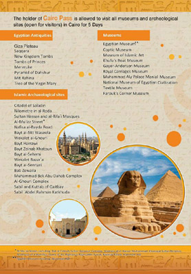صرح بذلك مصطفى الصغير عضو المكتب الفني لمساعد وزير الآثار، موضحاً أن هذه التصاريح تتيح لحامليها من الأجانب زيارة جميع المتاحف والمواقع الأثرية المصرية والإسلامية والقبطية المفتوحة للزيارة بمحافظتي القاهرة والجيزة لمدة خمسة أيام متتالية خلال مواعيد الزيارة الرسمية وبعدد غير محدود خلال فترة سريان التصريح.