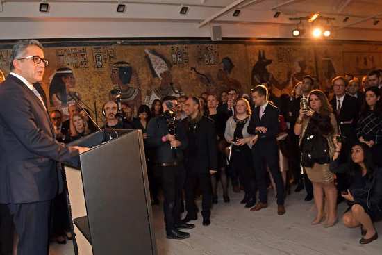 و خلال كلمته قال د. العناني ان المعرض يضم مجموعة صغيرة جدا من كنوز الملك الشاب الموجودة في مصر و التي يصل عددها الي اكثر من ٥٤٠٠ قطعة واصفا المعرض بمثابة عامل جذب لتشويق و تشجيع الشعب البريطاني و جميع شعوب العالم علي زيارة مصر لرؤية باقي كنوز الملك الشاب و التعرف علي حضارتها العريقة و الفريدة، مشيرا الي ان معرض توت عنخ امون في لندن يعتبر حدث خاص حيث تجمع بين الشعب البريطاني و الملك توت عنخ امون قصة حب خاصة منذ عام 1922 حين اكتشف عالم الاثار البريطاني هيوارد كارتر عام مقبرة الملك الشاب و كنوزها بوادي الملوك بالبر الغربي بمدينة الأقصر، مؤكدا علي ان الملك الشاب جاء اليوم الي العاصمة البريطانية لندن حاملا معه الشمس المشرقة و رسالة حب و سلام من الشعب المصري الي الشعب البريطاني.