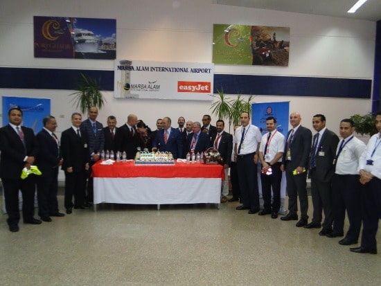 استقبل الكابتن هشام القشاط نائب مدير المطار يصاحبه ممثلي شركه ايزي جت وشركات الوكاله وعديد من العاملين بالمطار الطائره بالترحاب والورود وقام بتوزيع التورته علي الركاب ابتهاجا وترحابا بهم.