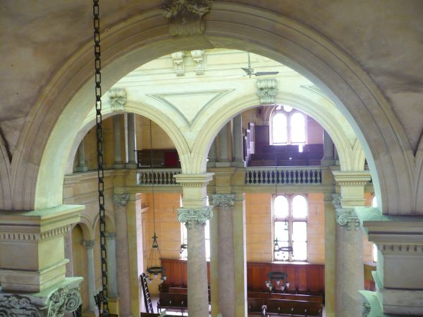 وعلى يسار الهيكل بابان ، أحدهما يؤدى إلى المكتبة والآخر يؤدى إلى حجرة خادم المعبد وللمعبد نوافذ من الزجاج المعشق الملون، ويتدلى من السقف مجموعة من الثريات الزجاجية والفضية لإنارة المعبد سمك حوائط المعبد 48سم وارتفاعها ما بين 12.30 إلى 18.30م.