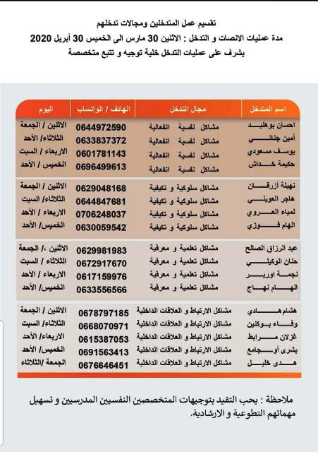 بإمكان مختلف الشرائح التعليمية العمرية وذويهم التواصل مباشرة مع الأساتذة والمتدخلين على أرقامهم الهاتفية من خلال لائحة الأرقام الهاتفية لإسداء النصائح والتوجيهات علما وأنّ التوقيت يمتد من الساعة الثانية بعد الظهر إلى الساعة السادسة مساء.