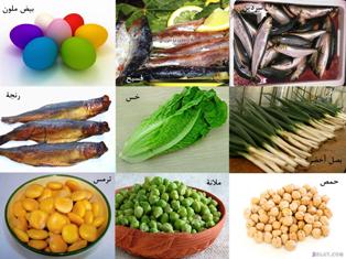 ارتبط عيد شم النسيم بأكلات معينة ارتبطت بفكر حضارى راقى للمصريين القدماء يتوافق مع طبيعة هذا العيد ومنها البيض الملون والذى أطلق عليه الأوروبيون بيض الشرق وهو يرمز لخلق الحياة كما ورد فى متون كتاب الموتى وأناشيد إخناتون " الله وحده لا شريك له خلق الحياة من الجماد فأخرج الكتكوت من البيضة " وارتبطت فكرة نقش البيض وزخرفته باعتبار ليلة العيد هى ليلة تحقيق الأمنيات فكانوا ينقشون دعواتهم وأمنياتهم على البيض ويضعوها فى سلال من سعف النخيل الأخضر ويتركونها فى شرفات المنازل والنوافذ ويعلقونها على أشجار الحدائق حتى تتلقى البركات عند شروق الشمس فتتحقق أمنياتهم