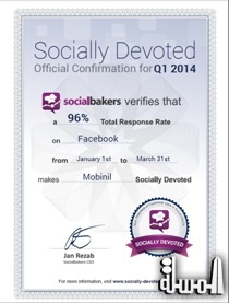 القاهرة "المسلة".... واصلت صفحة موبينيل على موقعFacebook“" حَصد المراكز المتقدمة من قبل مؤسسات عالمية في مجال التواصل الاجتماعي بحصولها على شهادة تقدير من قبل شركة "Socialbakers" كواحدة من أفضل 5 علامات تجارية في مصر استجابةً لاستفسارات العملاء خلال الربع الاول -----من عام 2014 وذلك بعد وصول عدد المتابعين لصفحتها الى 4 مليون شخص وردهاعلى 96% من تساؤلات العملاء في أقل وقت ممكن.