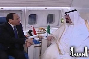 اقلاهرة "المسلة".... استقبل الرئيس عبد الفتاح السيسي، مساء أمس الجمعة بمطار القاهرة، جلالة الملك عبد الله بن عبد العزيز آل سعود، خادم الحرمين الشريفين، ملك المملكة العربية السعودية، هذا، وقد عقدت جلسة مباحثات ثنائية شارك فيها من الجانب المصري المهندس إبراهيم محلب، رئيس مجلس الوزراء،و الفريق أول صدقي صبحي، وزير الدفاع والإنتاج الحربي القائد العام -----للقوات المسلحة، وهاني قدري،وزير المالية، و سامح شكري، وزير الخارجية. ومن الجانب السعودي كلٌ من سمو الامير سعود الفيصل، وزير الخارجية، والدكتور إبراهيم بن عبد العزيز العساف، وزير المالية، وعدد من كبار المسئولين السعوديين، والسفير أحمد قطان، سفير المملكة العربية السعودية في مصر.