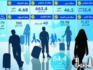دبى "المسلة" .... بلغ عدد المسافرين عبر مطارات الدولة أكثر من 64,4 مليون مسافر، خلال الشهور الثمانية الأولى من العام الجاري، وبفارق حوالي 4,8 مليون مسافر عن العام 2013، مسجلًا رقماً قياسياً في أول إحصاء شهري شامل تصدره الهيئة العامة للطيران.