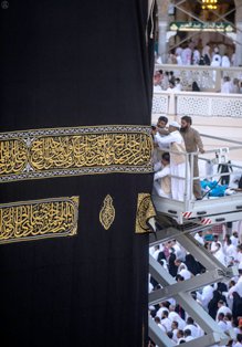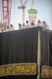 مكة المكرمة - المسلة- صالة التحرير ووكالة واس - راقبت أنظار المسلمين في مشارق الأرض و مغاربها عبر قناة القرآن الكريم وداخل المسجد الحرام عملية استبدال كسوة الكعبة المشرفة الحالية بكسوة جديدة جريا على العادة السنوية في اليوم التاسع من ذو -----الحجة من كل عام حيث قام منسوبي الرئاسة العامة لشؤون المسجد الحرام والمسجد النبوي بإشراف مدير عام المصنع الدكتور محمد باجودة ووكيل المصنع و مدير الإنتاج بإنزال ثوب الكعبة القديم واستبداله بثوب جديد تم صناعته من الحرير الخالص بمصنع كسوة الكعبة المشرفة.