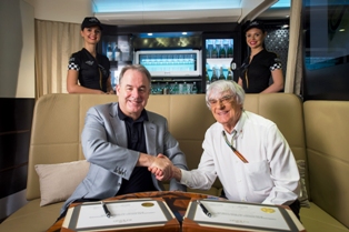 James Hogan, Etihad Airways’ President and Chief Executive Officer, and Bernie Ecclestone, Chief Executive Officer of Formula One group, finalise the new contract for the FORMULA 1 ETIHAD AIRWAYS ABU DHABI GR AND PRIX in the A380 Lobby mock-up at the airline’s Innovation Centre in Abu Dhabi. |