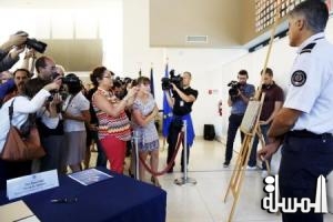 وسلمت سارة سالدانا مديرة الهجرة والجمارك الامريكية -----اللوحة الزيتية التي ترجع لعام 1911 للمسؤولين الفرنسيين خلال احتفال في السفارة الفرنسية.