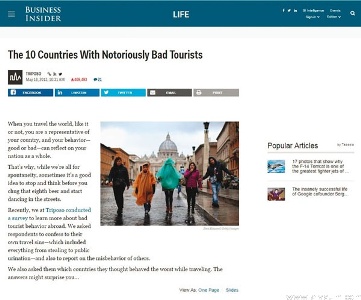 وتصدر السائح الأمريكي قائمة «أسوأ سياح 10 دول في العالم» حسب تقرير صادر عن مجلة "بزنس انسيدر" نشر -----مؤخرا عبر الموقع الإلكتروني لها، دون أي إشارة للسائح الخليجي أو السعودي ضمن القائمة التي جمعت 10 دول، نقلا عن استطلاع واسع لموقع «ترب تسو» مختص بمتابعة المواضيع المتعلقة بالسياحة والسفر.