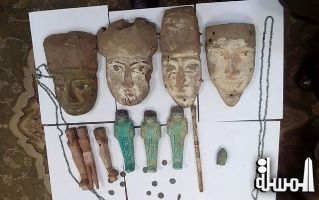 وأضاف أن المضبوطات تتضمن أيضا أربعة أقنعة خشبية لوجه آدمي يعلو جميعها طبقة من الجص الملون ويظهر عليها بقايا ألوان كما تظهر العين محددة باللون الأبيض والأسود، بالإضافة إلي عصا خشبية يبلغ طولها 24 سم تقريبا ويوجد عليها بقايا ألوان، وعقد من قطع الفيانس صغيرة الحجم بطول 158 سم، بالإضافة إلي 13 قطعة عملة معدنية من العصر اليوناني الروماني .