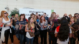 واستقبل السياح بالورود فى صالة مطار شرم الشيخ الدولى ووزع عليهم اطفال يرتدوا -----علم مصر الورود والإعلام الوفد، بحضور اللواء هانى رمزى نائب مدير مطار شرم الشيخ الدولى وسالم صالح مدير تنشيط السياحة بجنوب سيناء.