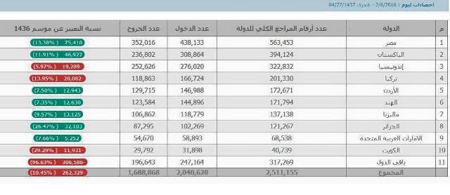 أشارت الإحصائية إلى أن مصر قد حصلت على 563 ألفاً و453 تأشيرة  محققة بذلك زيادة  بلغت مقدارها 13.4% ، وجاءت باكستان فى المركز الثانى حيث حصلت على 394 ألفاً و124 تأشيرة وبزيادة قدرت بنحو 11.9% ، بينما جاءت أندونيسيا  فى المركز الثالث بنحو 322 ألفاً و832 تأشيرة زيارة ، وجاءت تركيا فى المركز الرابع بنحو 201 ألفاً و330 تأشيرة لتحقق تراجعاً قدر بنحو 13.9%، فى الوقت الذى حلت فيه المملكة الأردنية الهاشمية  فى المركز الخامس بمنحها 172 ألفاً و671 تأشيرة بزيادة بلغت 7.5%.