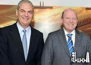 Thierry Antinori, Emirates Executive Vice President and Chief Commercial Officer, (left) and Alain St.Ange, the Seychelles Minister of Tourism and Culture & An Emirates Boeing 777-300ER which is used on the double daily service between Dubai and the Seychelles |