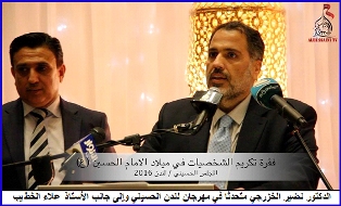من جانبه قال مدير الحفل الجماهيري، الإعلام العراقي الأستاذ علاء الخطيب، وهو يقدّم الدكتور نضير الخزرجي لاستلام درع التكريم: (إنّ آية الله الشيخ محمد صادق الكرباسي رجل واصل الليل بالنهار ولم يدخر جهدًا من أجل الهم الذي حمله والحلم الذي راوده في توثيق كل ما كُتب وأُلِّف نثرا وشعرا ورواية عن الإمام الحسين(ع) ليؤسس أكبر دائرة معارف وبلغات متعددة لتغني الباحثين والكتاب)، وأضاف الأستاذ الخطيب: (إن الموسوعة الحسينية عمل يستحق الإحترام والتقدير، رافق المؤلف خيرة ممن آمنوا بمشروعه ليرى النور، منهم الدكتور نضير الخزرجي وآخرون، وعرفانًا بجميل ما قدّم في هذا الجانب وبالإضافة الى خدماته الجليلة في طريق سيد الشهداء، يقوم اليوم المجلس الحسيني بتكريم هذا العلم، وقد أناب عنه في تسلم درع التكريم رفيق دربه الدكتور نضير الخزرجي).