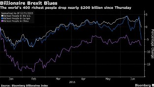 وأفادت وكالة "بلومبرغ" العالمية أن أغنى أثرياء العالم خسروا في اليوم الأول (الجمعة 24 يونيو/حزيران) في أعقاب التصويت البريطاني على الخروج 127 مليار دولار، وفي اليوم الثاني من التداولات (الاثنين 27 يونيو/حزيران) 69.2 -----مليار دولار.