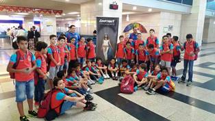 بالصور ..طلاب أكاديمية الخطيب لكرة القدم على متن طائرة مصرللطيران لزيارة برشلونة